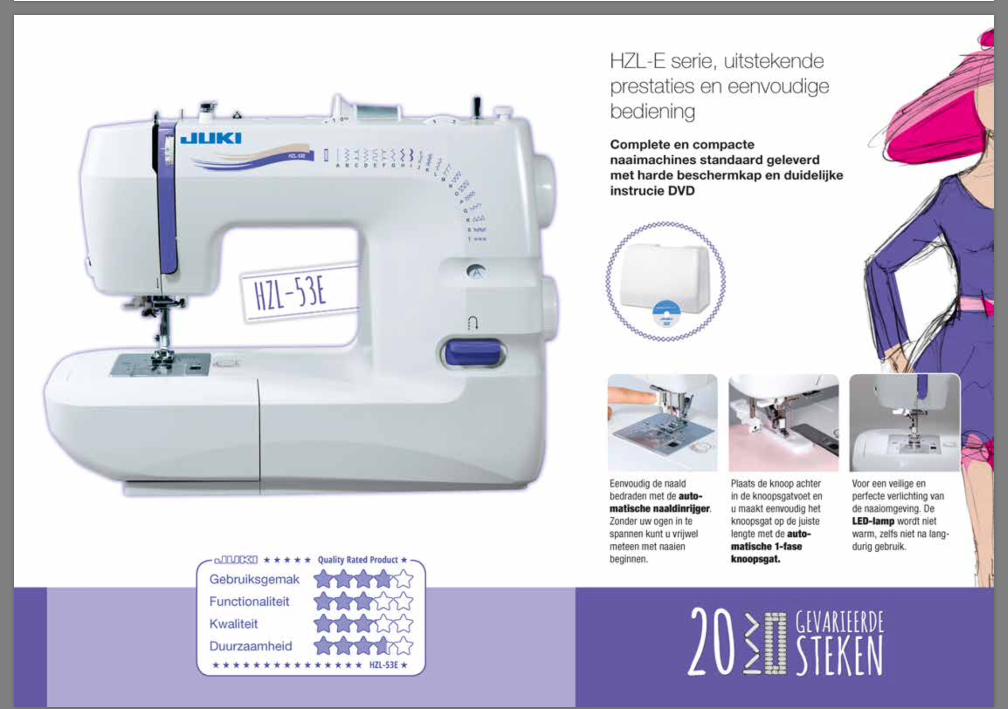 De Juki HZL-53E is een eenvoudig te bedienen basis naaimachine, met een 1-fase knoopsgatenautomaat.